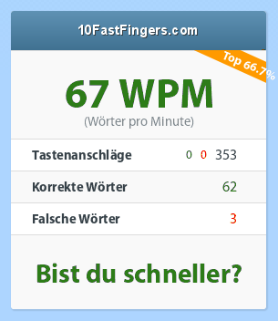 Habe leider nie systematisch tippen gelernt und arbeite daher im Zweifingersystem. Aber nicht ganz so schlecht, finde ich. Mein Ergebnis war 67 WPM, Tastenanschläge 353, korrekte Wörter 62, falsche Wörter 3 (wobei ich mit so einer Art des Diktats meine Probleme habe, weil ja kein Wort mit dem folgenden in Zusammenhang steht und mich das schon ziemlich irritierte).
